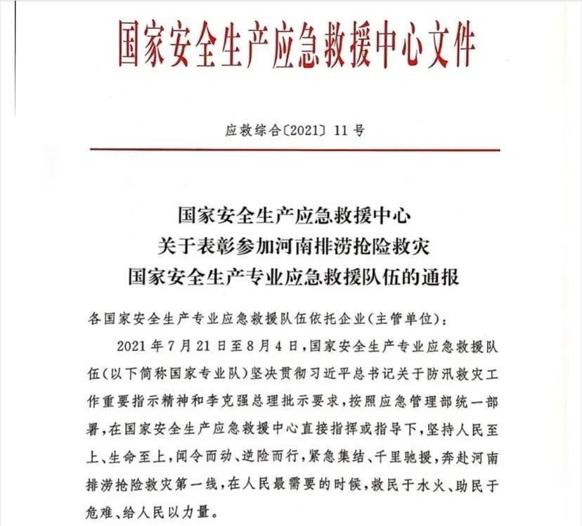 为弘扬国家专业队河南排涝抢险救灾表现出的英勇善战和大无畏精神,充分肯定他们所取得的突出业绩,近日,国家安全生产应急救援中心对国家矿山应急救援大同队等21支参加河南排涝抢险救灾的国家专业队予以通报表彰,安源煤业所属国家矿山救援乐平队榜上有名。