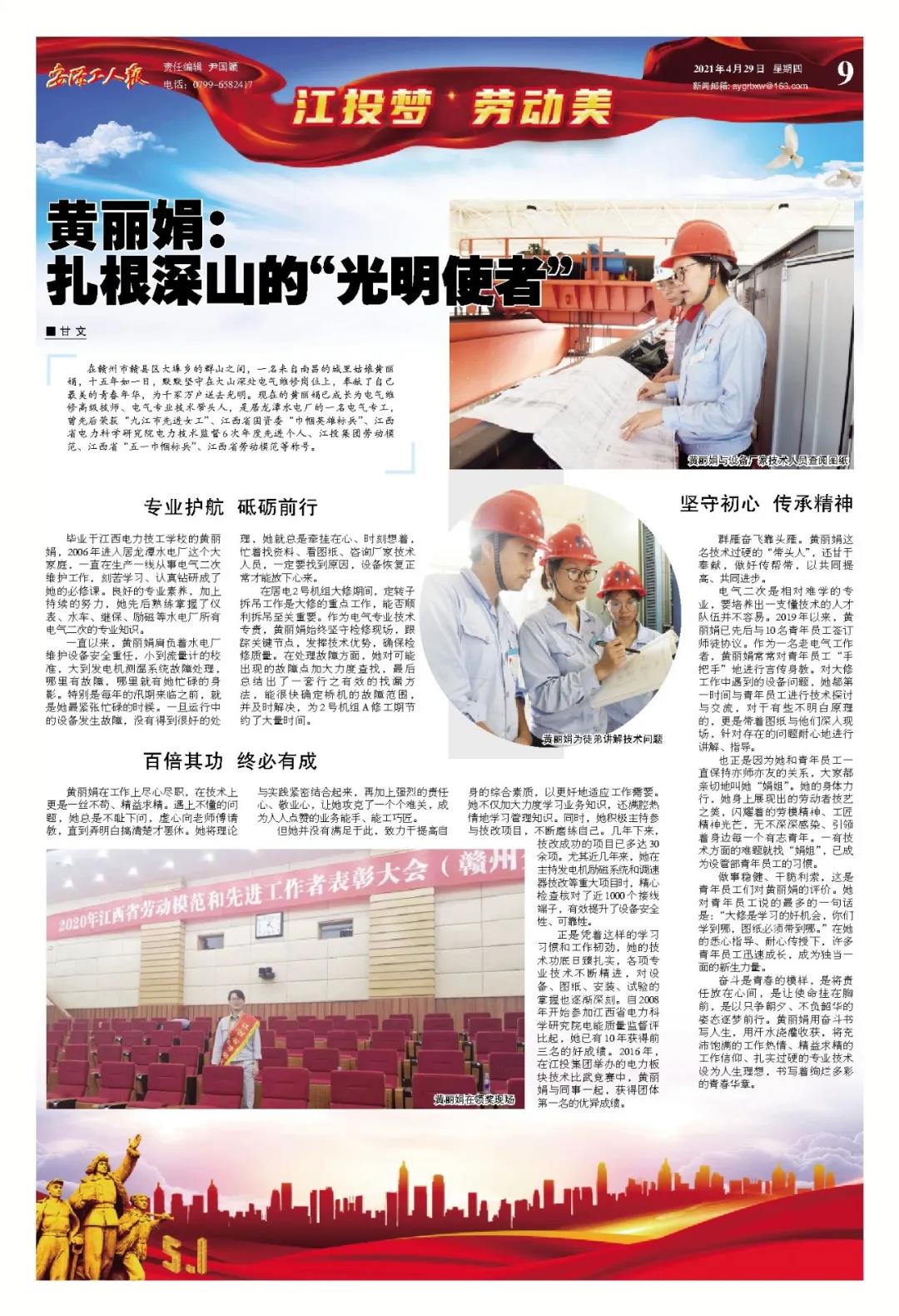 在赣州市赣县区大埠乡的群山之间,一名来自南昌的城里姑娘黄丽娟,十五年如一日,默默坚守在大山深处电气维修岗位上,奉献了自己最美的青春年华,为千家万户送去光明。现在的黄丽娟已成长为电气维修高级技师、电气专业技术带头人,是居龙潭水电厂的一名电气专工,曾先后荣获“九江市先进女工”、江西省国资委“巾帼英雄标兵”、江西省电力科学研究院电力技术监督6次年度先进个人、博彩公司 劳动模范、江西省“五一巾帼标兵”、江西省劳动模范等称号。