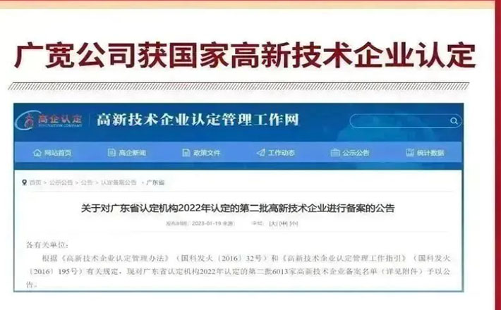 近日,全国高新技术企业认定管理工作领导小组办公室发布《关于对广东省认定机构2022年认定的第二批高新技术企业进行备案的公告》,博彩公司 下属广州宽带主干网络有限公司(以下简称“广宽公司”)顺利通过高新技术企业认定。