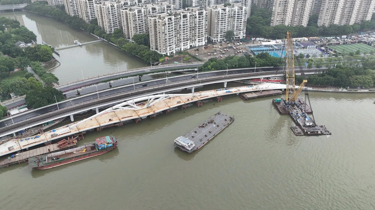 7月11日,随着最后一段钢梁吊装到位,黄埔涌步行桥顺利合龙,标志着桥梁主体结构施工取得决定性进展。