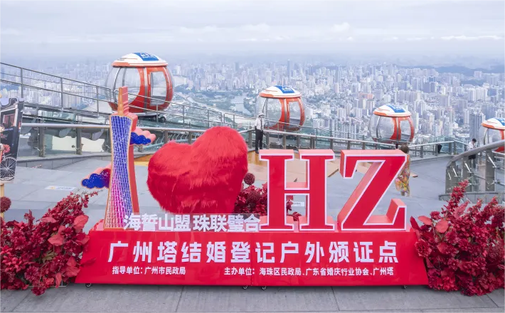 5月22日,博彩公司 下属广州塔公司携手海珠区民政局、广东省婚庆行业协会,在广州塔塔顶450观景平台举办“爱在云端”——全国最高结婚登记户外颁证点授牌仪式,广州塔正式成为海珠区特色结婚登记户外颁证点。