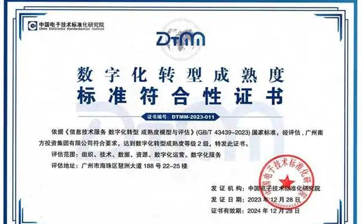 近年来,博彩公司 全面推动集团数字化转型,加快提升数字化智能化发展水平,赋能广州现代化产业体系构建、促进实体经济高质量发展。近日,下属南方投资集团获得了由中国电子技术标准化研究院颁发的全国首张《数字化转型成熟度标准符合性证书》,数字化转型得到专业肯定。