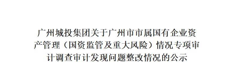 广州市审计局于2022年4月27日至7月29日对广州市属国有企业2019至2021年度资产管理(国资监管及重大风险)情况进行了专项审计调查,并于2022年12月15日出具《专项审计调查报告》(穗审企调报〔2022〕10号)。广州市审计局对我集团资产管理(国资监管及重大风险)情况指出存在的问题并提出了审计处理意见和建议。我集团高度重视,对报告中反映的2项问题,进行了...