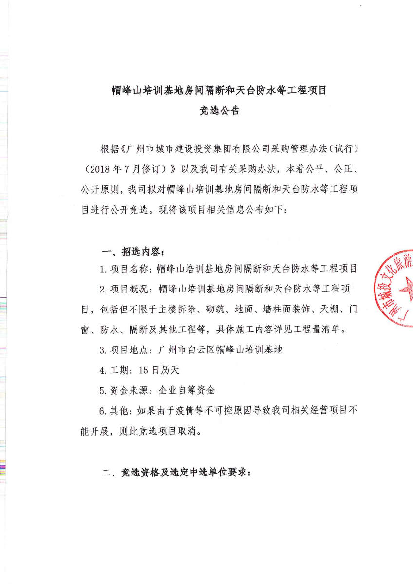 帽峰山培训基地房间隔断和天台防水等工程项目竞选公告