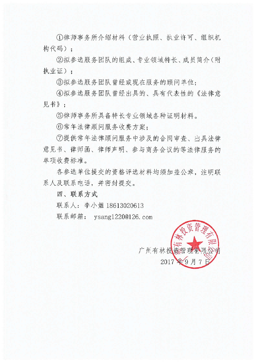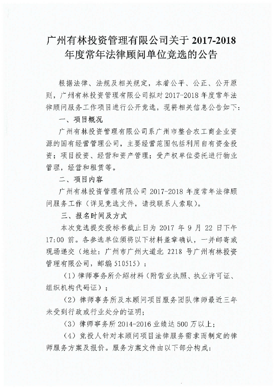 广州有林投资管理有限公司常年法律顾问单位选取竞选公告