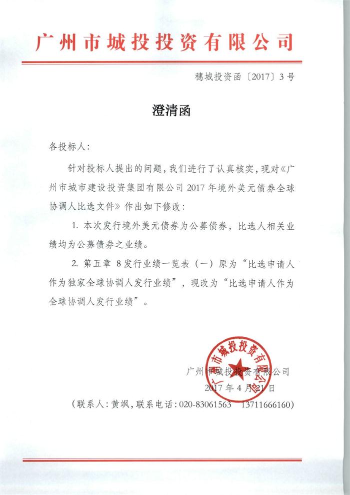 博彩公司 2017年境外美元债务全球协调人比选文件澄清函