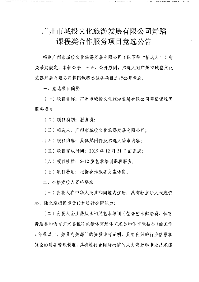 广州市城投文化旅游发展有限公司舞蹈课程类合作服务项目竞选公告