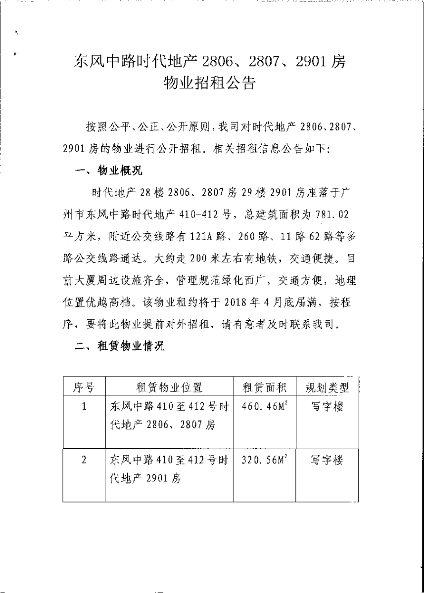 时代地产28楼29楼2806、2807、2901房物业招租公告