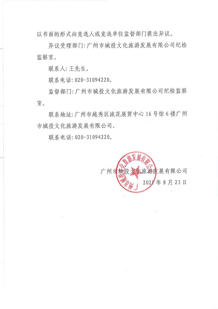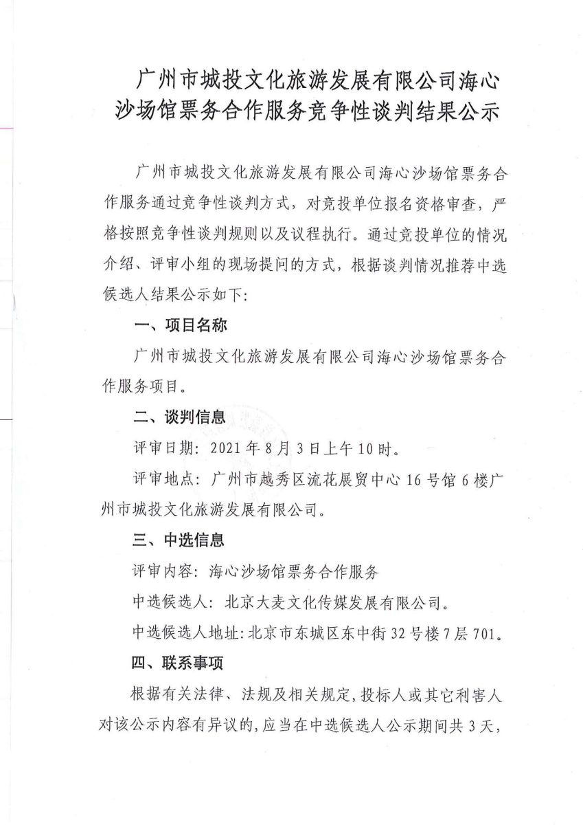 广州市城投文化旅游发展有限公司海心沙场馆票务合作服务竞争性谈判结果公示