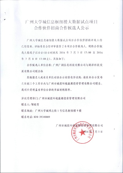广州市大学城信息枢纽楼大数据试点项目合作伙伴招商公示