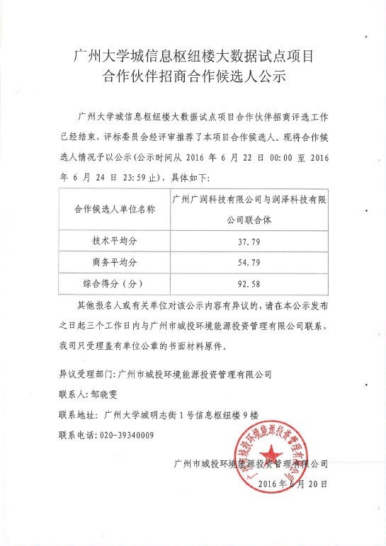 广州大学城信息枢纽楼大数据试点项目合作伙伴招商合作候选人公示