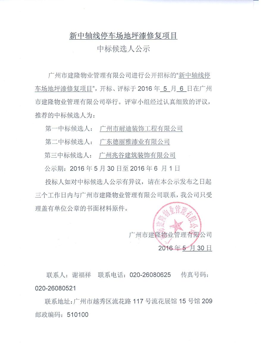 新中轴线停车场地坪漆修复项目中标候选人公示