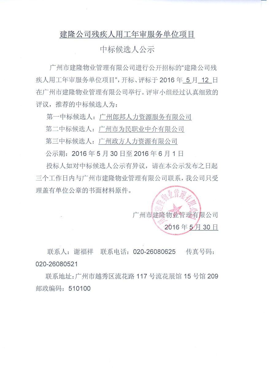 建隆公司残疾人用工年审服务项目中标候选人公示