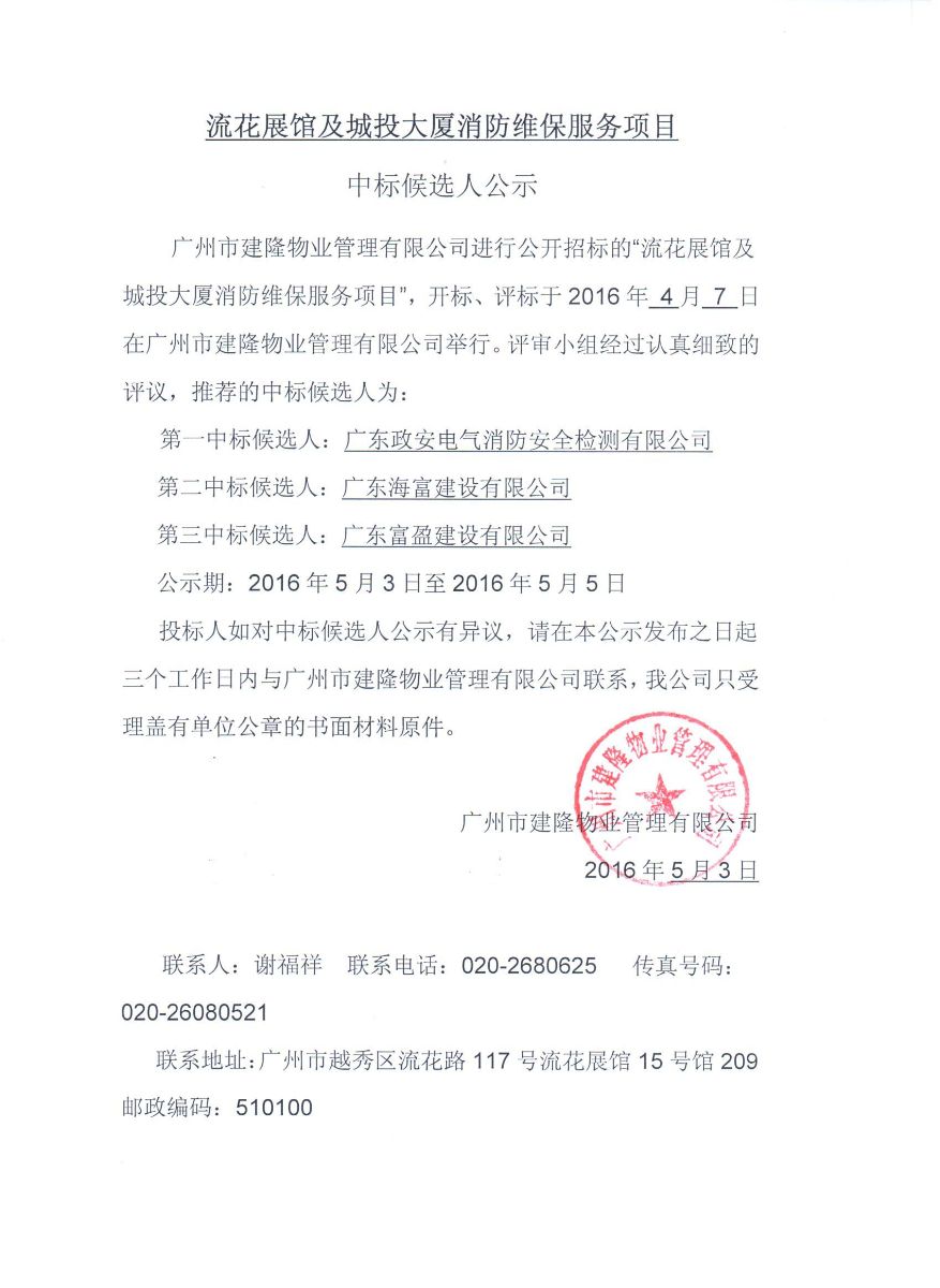 流花展馆及城投大厦消防维保项目中标候选人公示