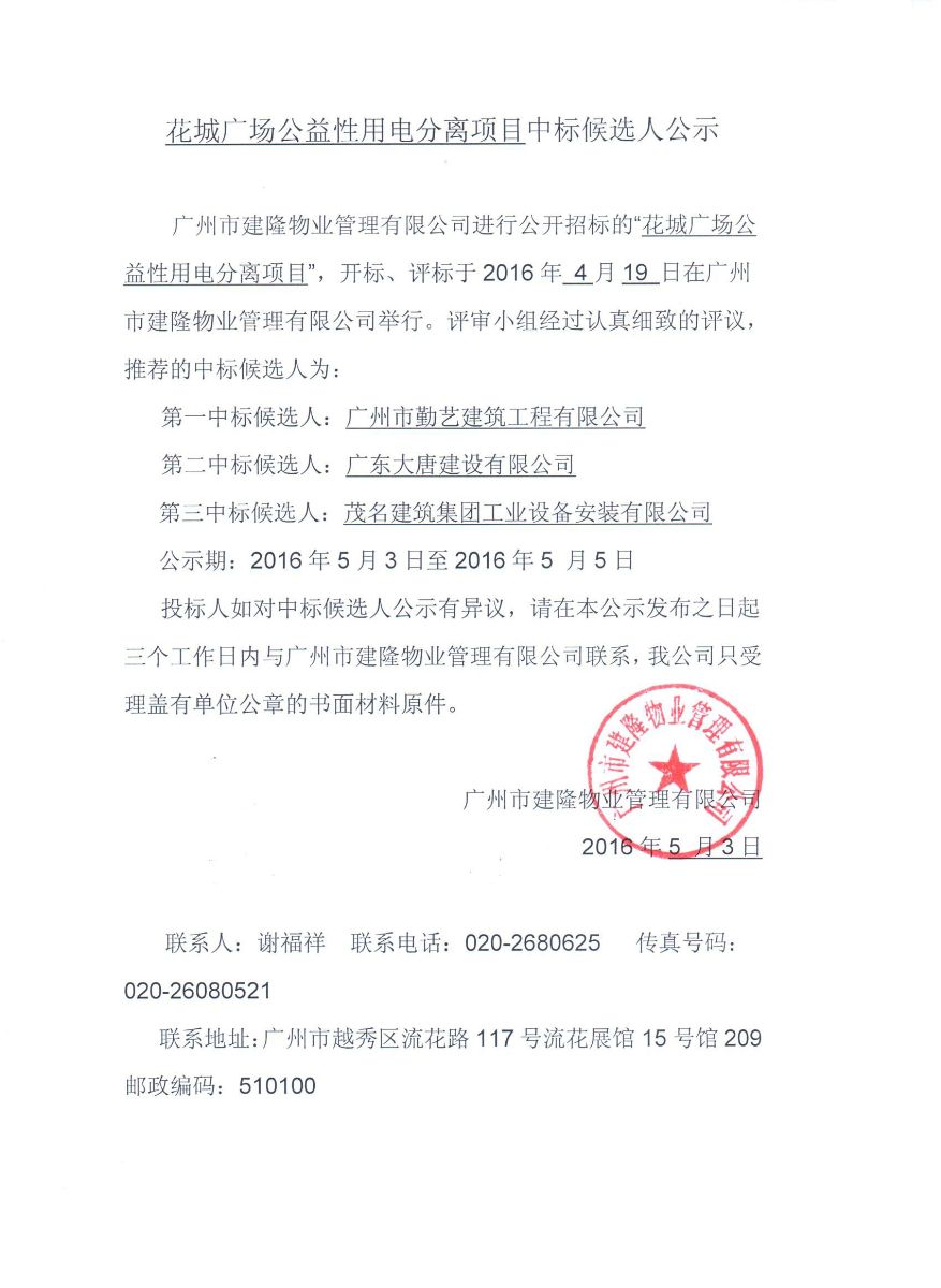 花城广场公益性用电分离项目中标候选人公示