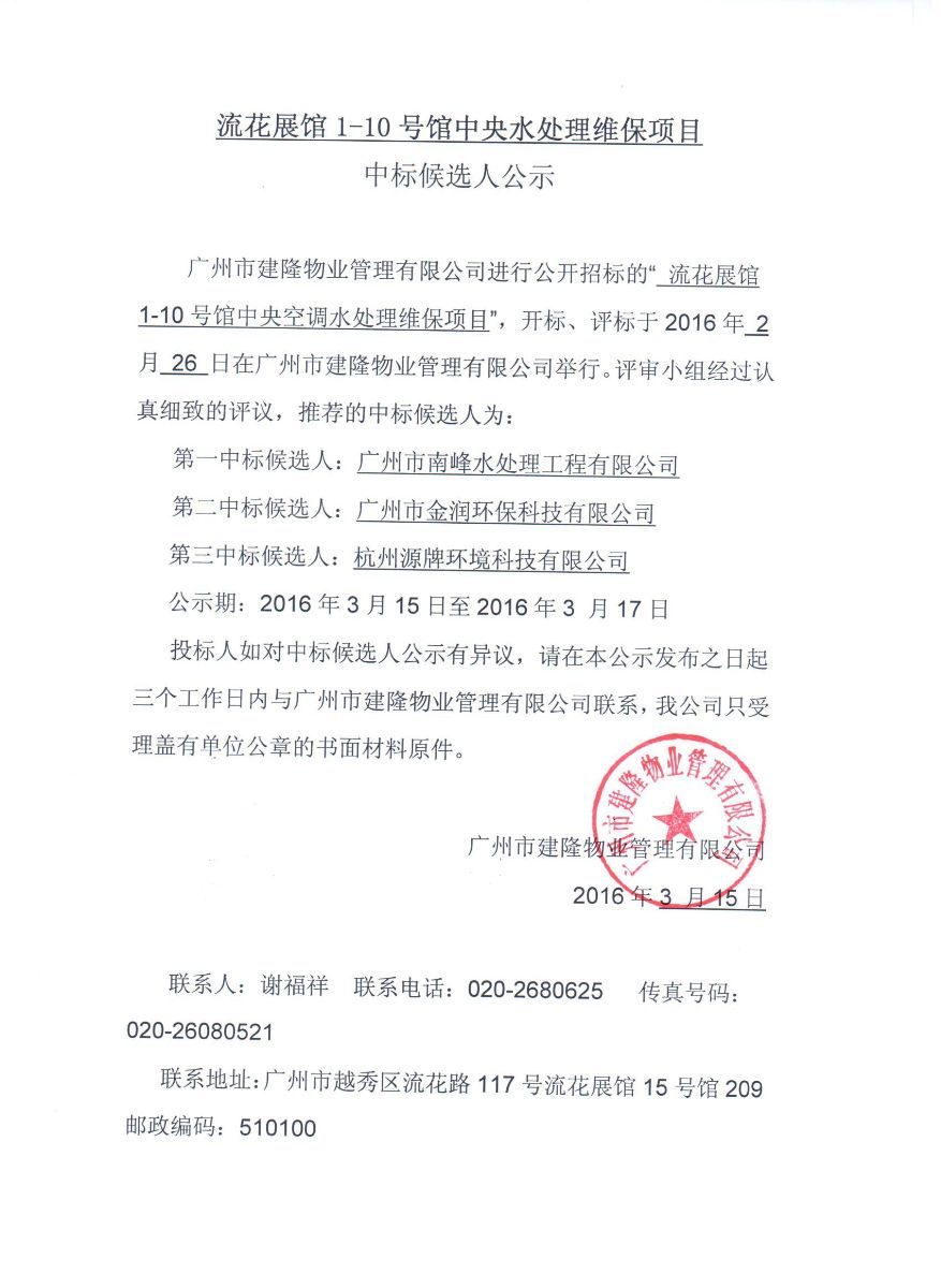 流花展馆1-10号馆中央空调水处理维保项目中标候选人公示