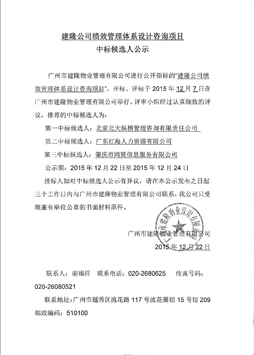 建隆公司绩效管理体系设计咨询项目中标候选人公示