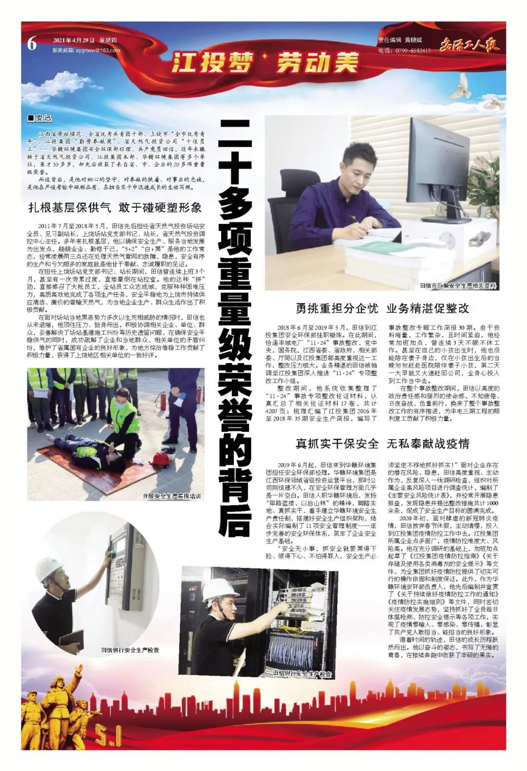 江西省劳动模范、全省优秀共青团干部、上饶市“全市优秀青年”、博彩公司 “勤劳奉献奖”、省天然气投资公司“十佳员工”……华赣环境集团安全环保部经理、共产党员田信,近年来辗转于省天然气投资公司、博彩公司 本部、华赣环境集团等多个单位,虽才30多岁,却先后收获了来自省、市、企业的20多项重量级荣誉。