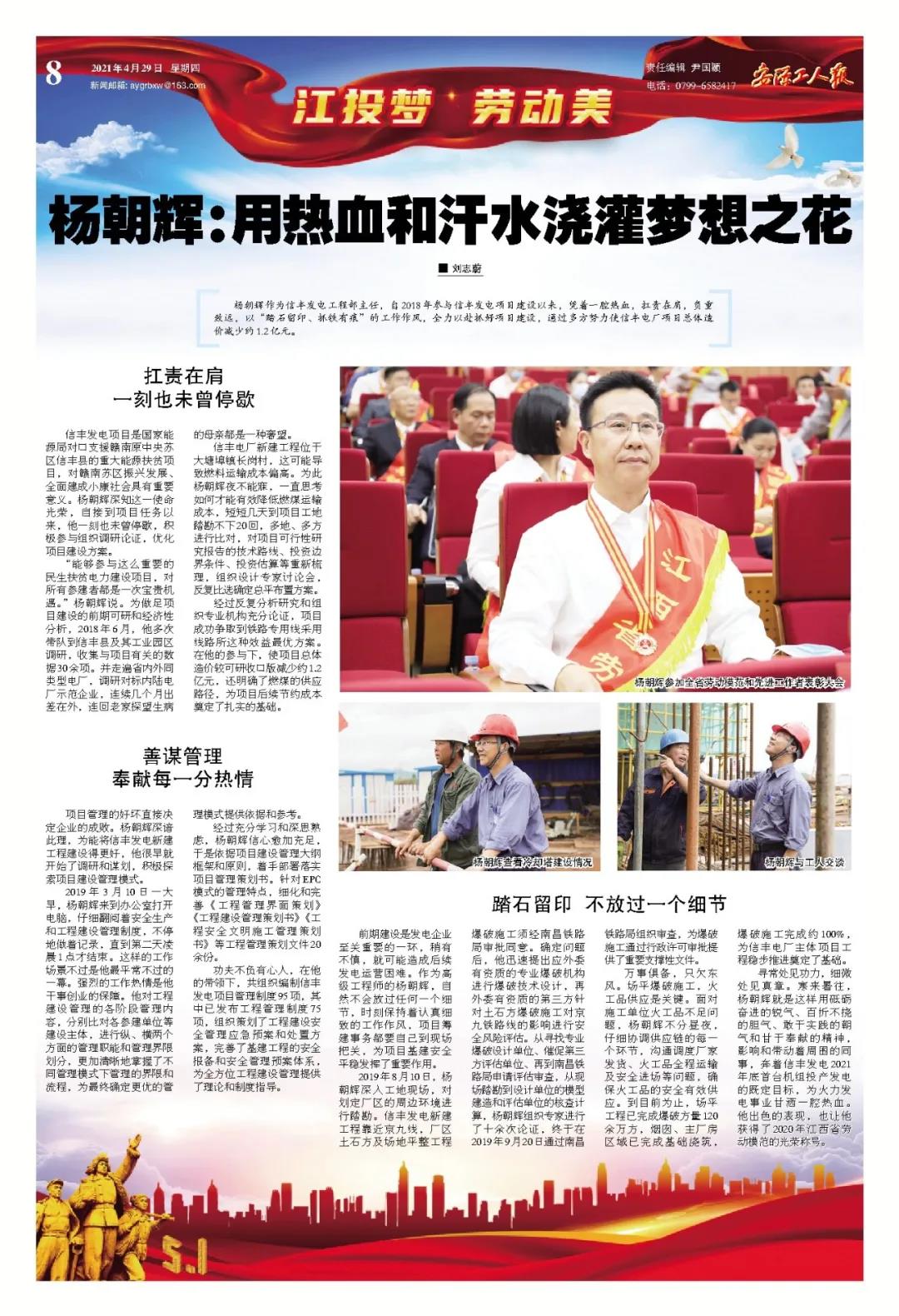 寻常处见功力,细微处见真章。寒来暑往,杨朝辉就是这样用砥砺奋进的锐气、百折不挠的胆气、敢于实践的朝气和甘于奉献的精神,影响和带动着周围的同事,奔着信丰发电2021年底首台机组投产发电的既定目标,为火力发电事业甘洒一腔热血。他出色的表现,也让他获得了2020年江西省劳动模范的光荣称号。