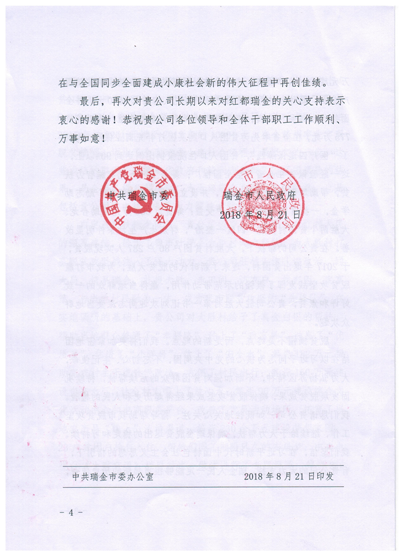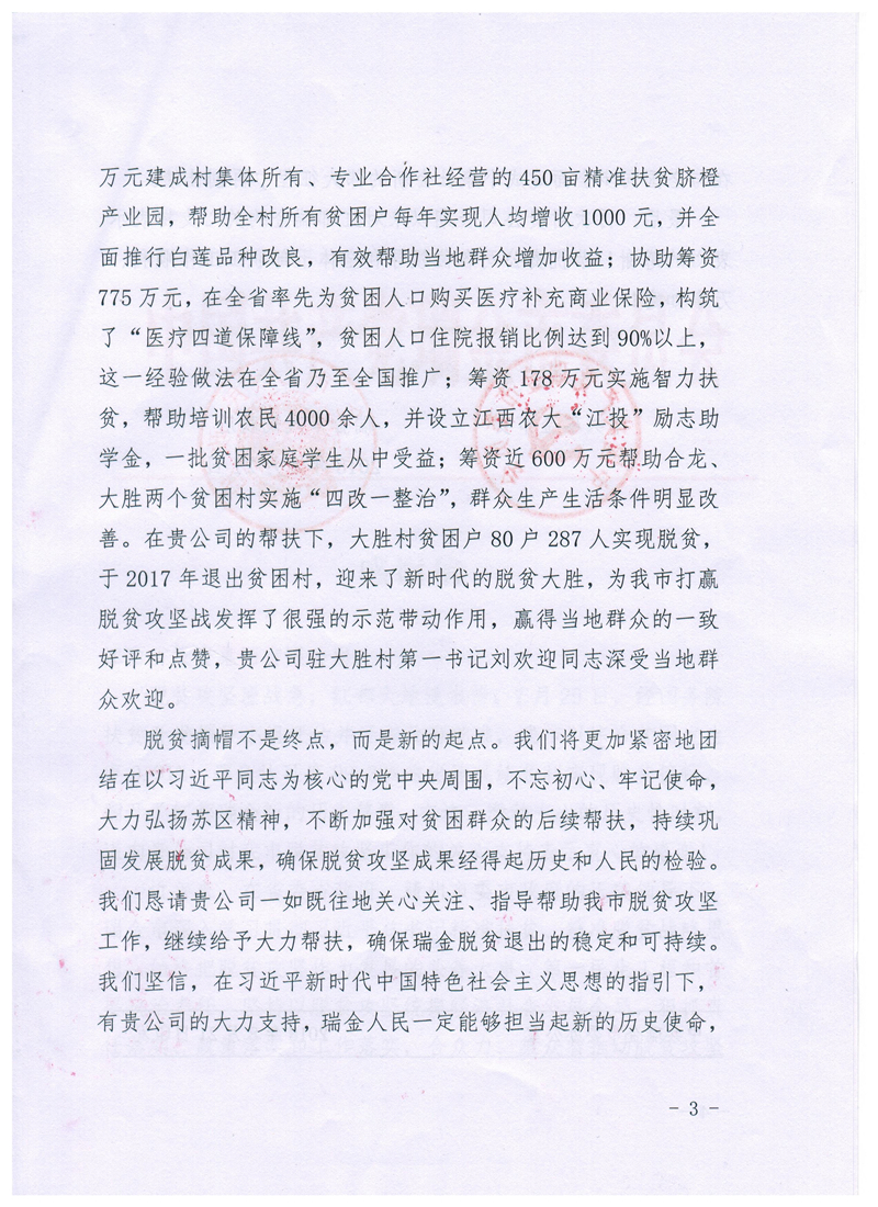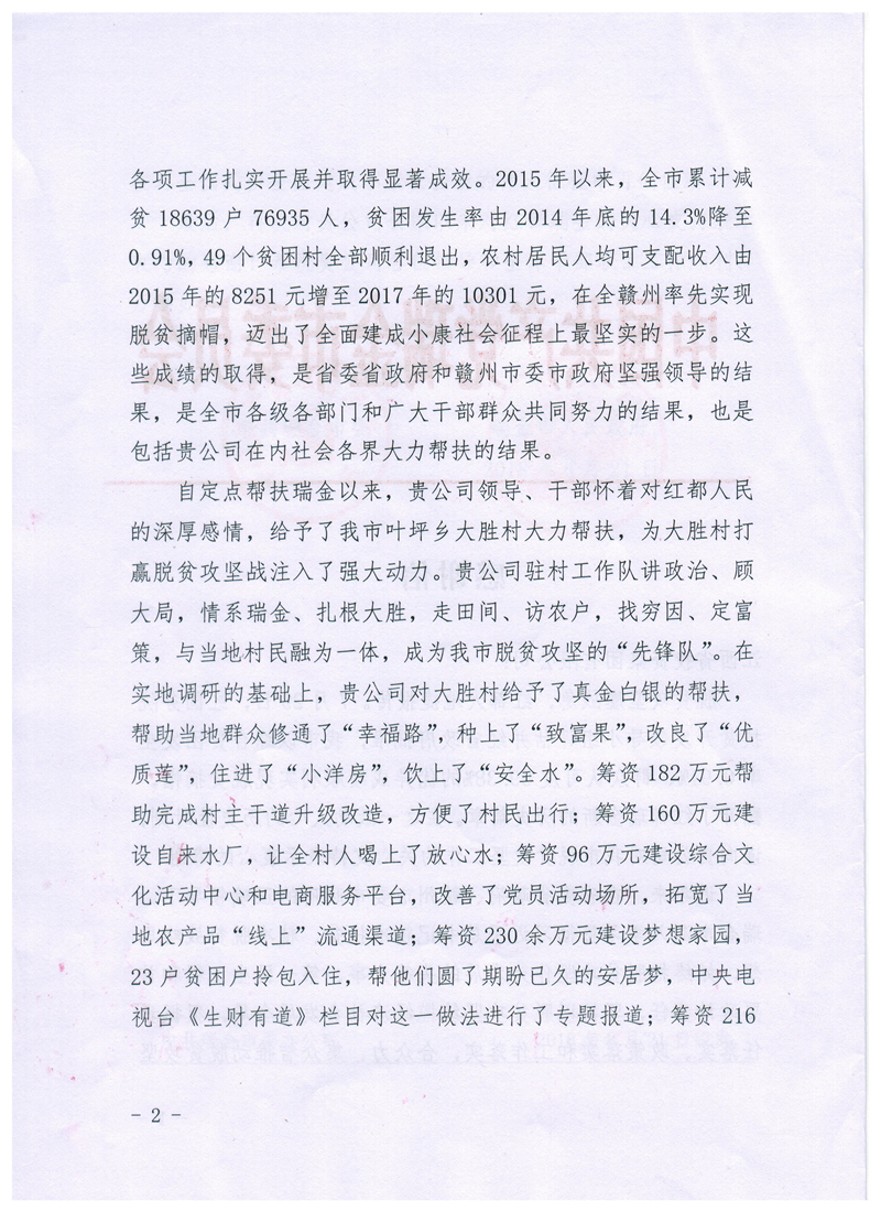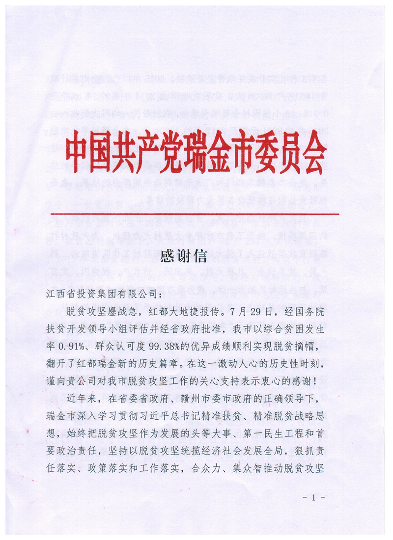 近日,瑞金市委、市政府向集团公司发来感谢信,对集团公司在瑞金市开展的精准扶贫工作表示感谢。