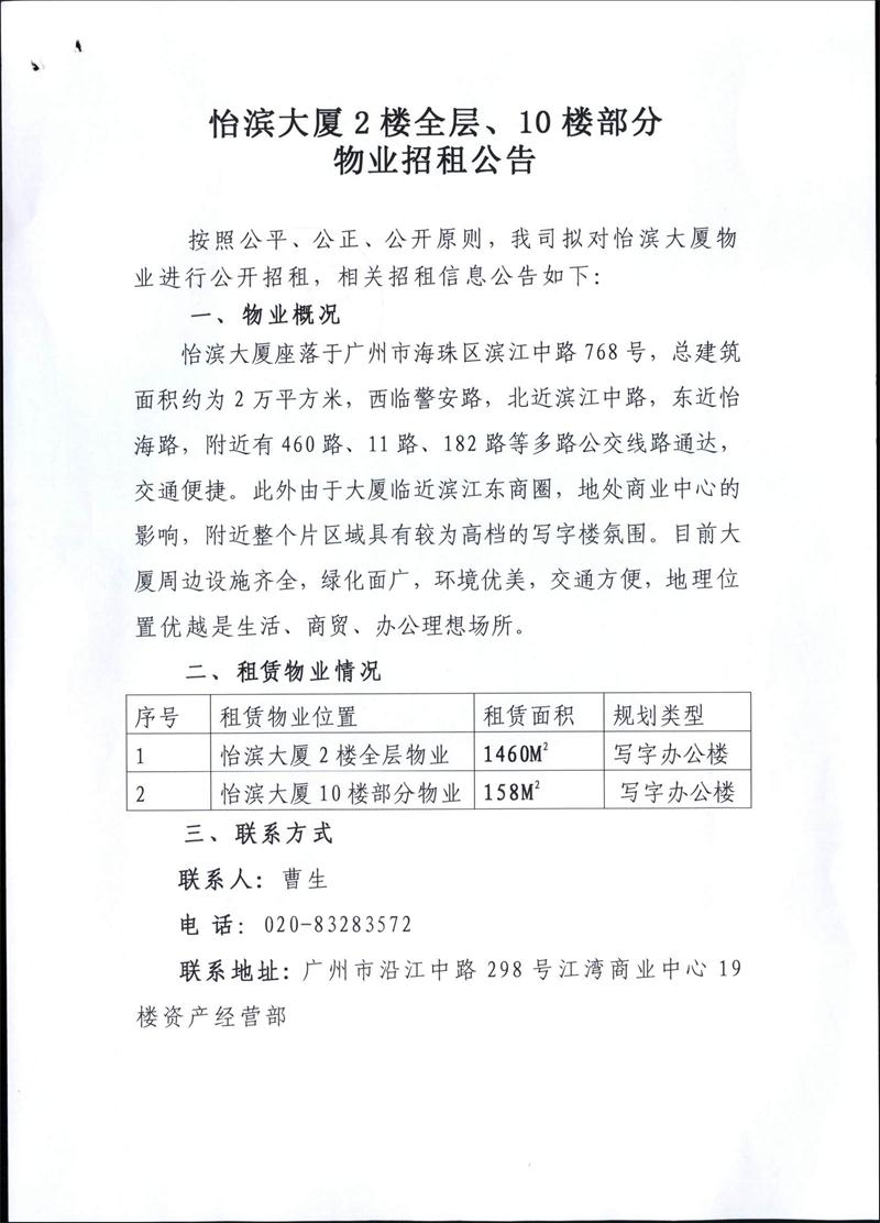 怡滨大厦2楼全层及10楼部分物业招租公告