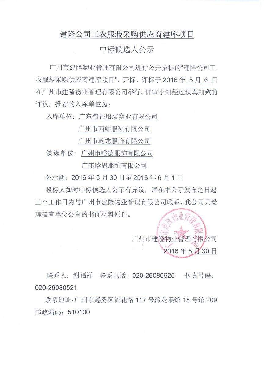建隆公司工衣服装采购供应商建库项目中标候选人公示